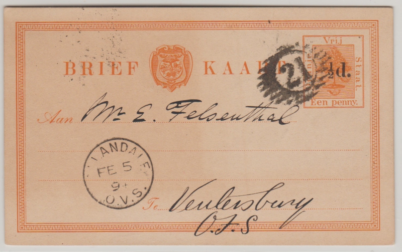Oranje Vrij State, 1/2d. Überdruck- GS als Fernpostkarte von Alandale nach Ventersburg