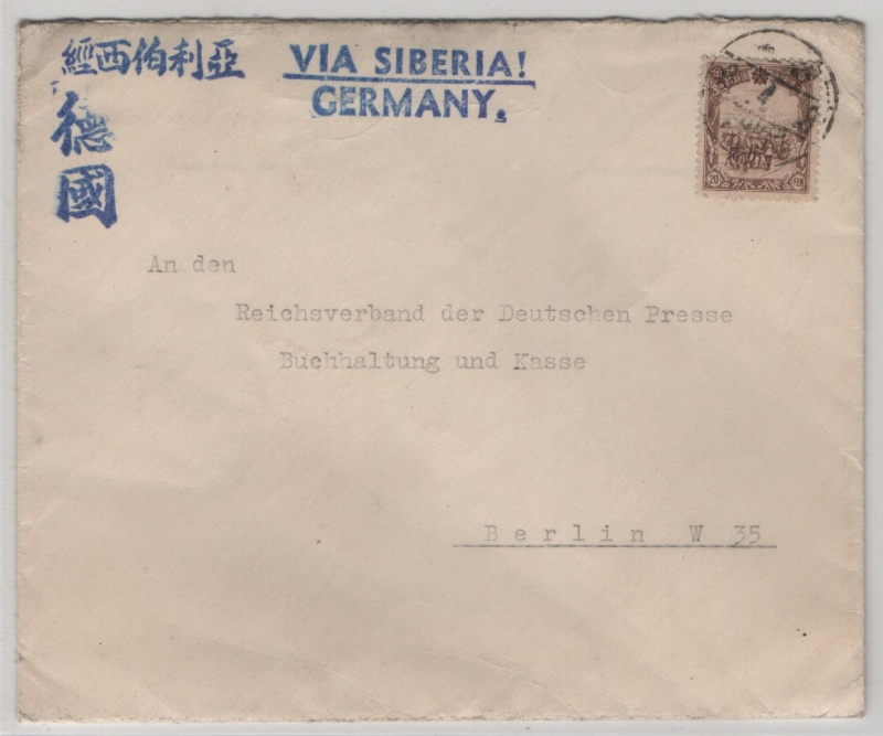 China / Mongolei, ca. 1920, 20 Fen EF auf Auslandsbrief von Mukden (via Sibirien) nach Berlin