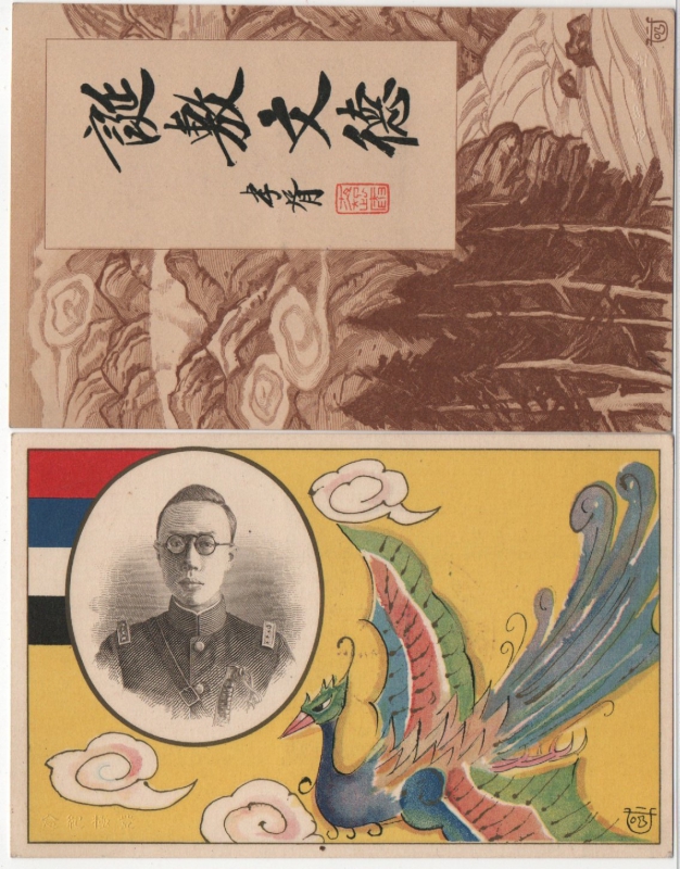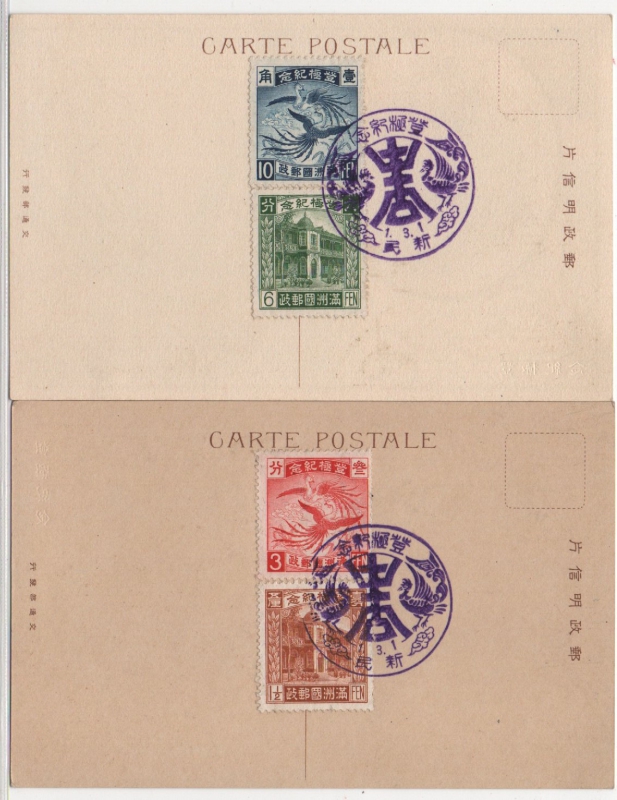 China, ca. 1900- 20, 1,5, 3, 6 + 10 FEN rs. auf 2 Postkarten zum Kaisergeburtstag / Jubiläum / Intronisation, nicht gelaufen