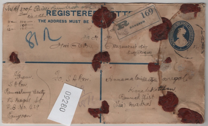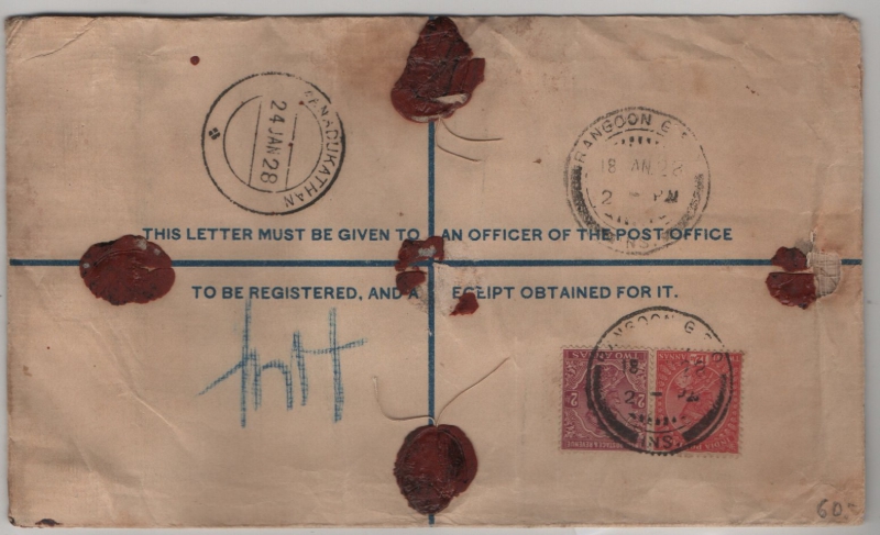 Indien / Burma, 1928, 16 A. MiF auf R.- (Wertbrief) von Rangoon (Burma) nach Kanadukathan (Indien). Interessant!