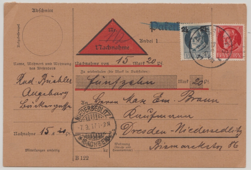 Bayern, 1917, Mi.- Nr.: 111 + 114 als MiF auf Nachnahme- Paketkarte für ein Paket von Augsburg nach Dresden