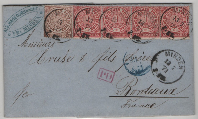 NDP, 1871, Mi.- Nr.: 15 + 16 (4x) als MiF auf Auslandsbrief von Minden nach Bordeaux (Fr.), dekorativ!