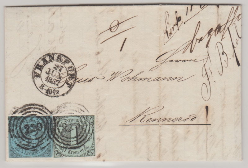 T + T, 1857, Mi.- Nr.: 7 (b) + 8 als MiF auf Fernbrief von FF/M nach Rennerod
