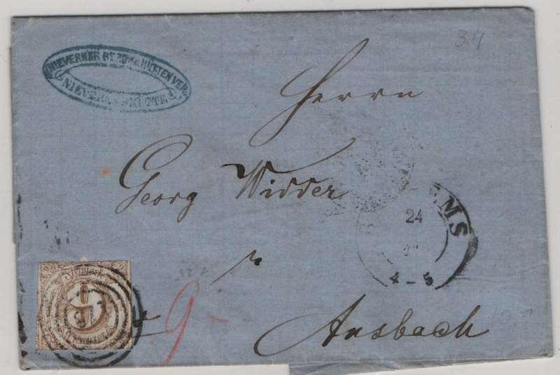 T + T, ca. 1853, Mi.- Nr.: 34 als EF auf Fernbrief von Nievennerhütte nach Ansbach