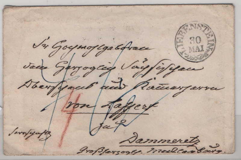 Meckl.- Schwerin, Incomming mail, ca. 1850, Inlands- Fernbrief, von Liebensten via ..., Eisenach, ..., nach Dammeretz