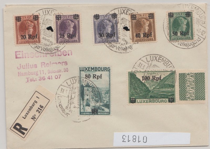 Luxemburg, 1941, Nrn.: 17- (ohne Nr.: 30) 32, auf 2 Einschreiben- Briefen nach Hamburg, rs. mit Ankunftsstempeln