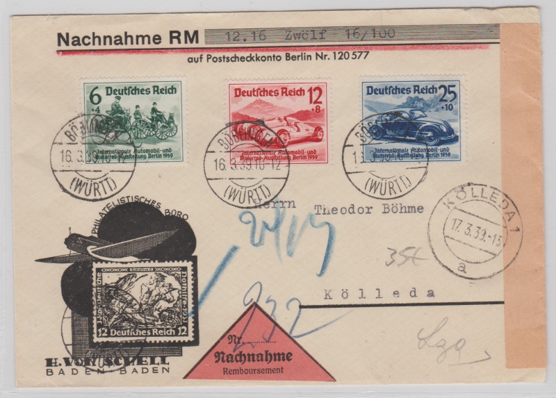 DR. Nrn.: 686- 688 als Nachnahme- Satzbrief, von Böblingen nach Kölleda, sehr dekorativ!