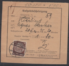 III. Reich, 1940, Mi.- Nr.: 518 als EF auf Telegrammaufgabebescheinigung (!!!) von Eggenburg, veritable kleine Rarität!
