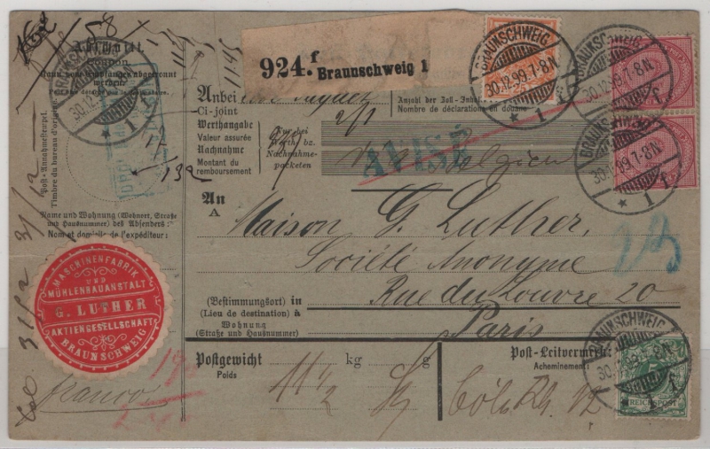 DR, 1899, Mi.- Nr.: 37 (2x) + 46 + 49 in MiF auf Auslandspaketkarte, für ein Paket von Braunschweig nach Paris (Fr.)