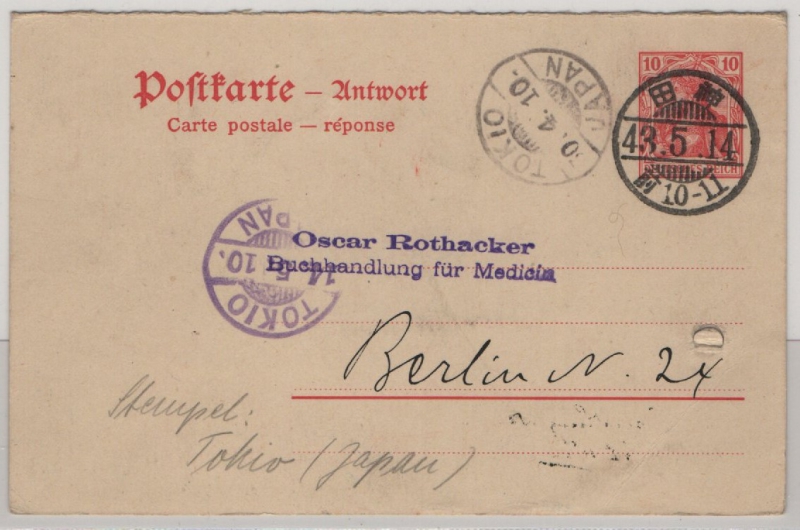 DR, Germania, 1910, 10 RPfg.- Antwort- GS- Karte, A.- Teil (Mi.- Nr.: P 82 A?), gelaufen von Tokio (!) nach Berlin