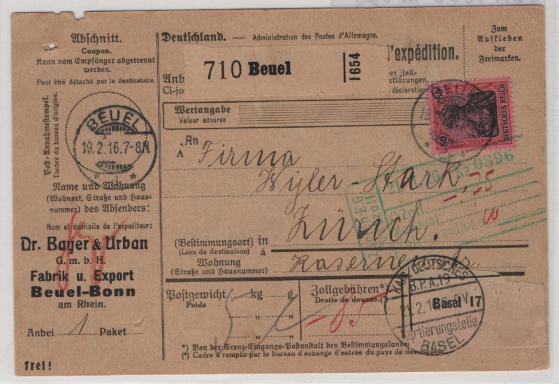DR, Germania 1916, Mi.- Nr.: 93 II als EF auf Auslandspaketkarte für 1 Paket von Beuel nach Zürich (CH)