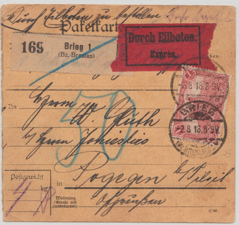 DR, Germania, 1918, Mi.- Nr.: 94 II als EF auf Eilboten- Paketkartenstammteil, für 1 Paket von Brieg nach Pogegen