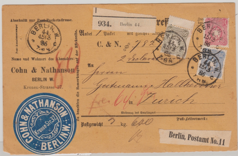 DR- Pfennig, 1886, Mi.- Nr.: 41, 42 + 44 als MiF auf Auslandspaketkarte von Berlin nach Zürich (CH)