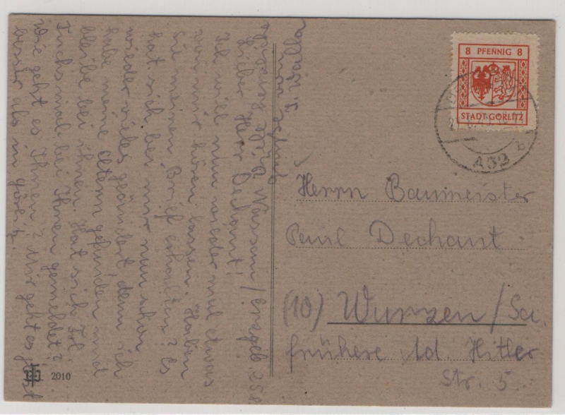 Dt. Lokalausgaben- Ost, 1945, Görlitz, Mi.- Nr.: 3, als EF auf Fernpostkarte von Dresden nach Wurzen, selten!