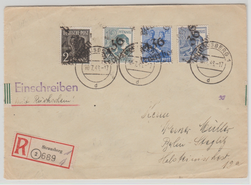 Bez. 36 Strausberg: Mi.- Nr.: 166VII, 170VII, 178VII + 181VII als MiF auf Einschreiben- Fernbrief von Strausberg nach Berlin