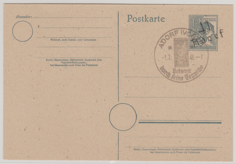 SBZ- Handstempel, 1948, Bez. 41, Adorf, 12 Pfg. GS, gefälligkeitsgestempelt, rs. gepr. Dr. Modry BPP