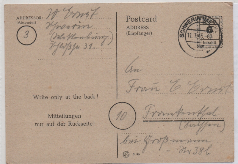 MVP, 1945, Behelfs- GS. Mi.- Nr.: 793, bedarfsgebraucht von Schwerin nach Frankenthal, 2. Tag der Sowietischen Besatzung!