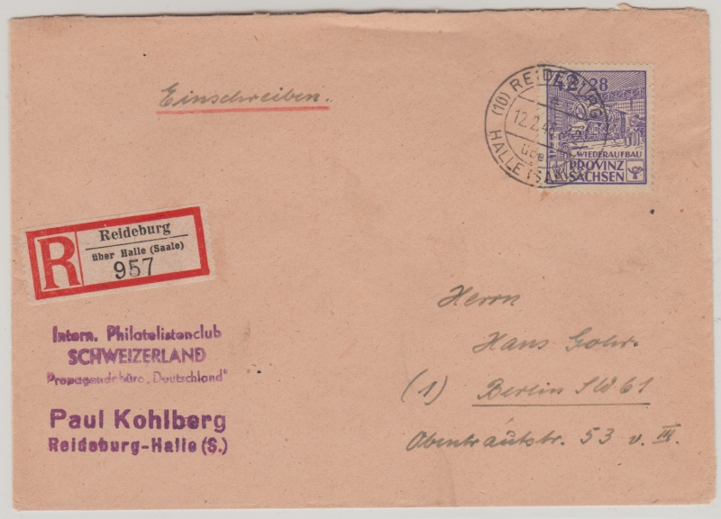 SBZ, Provinz Sachsen, 1946, Mi.- Nr.: 89A als EF auf Einschreiben- Fernbrief von Reideburg nach Berlin, geprüft Ströh BPP!