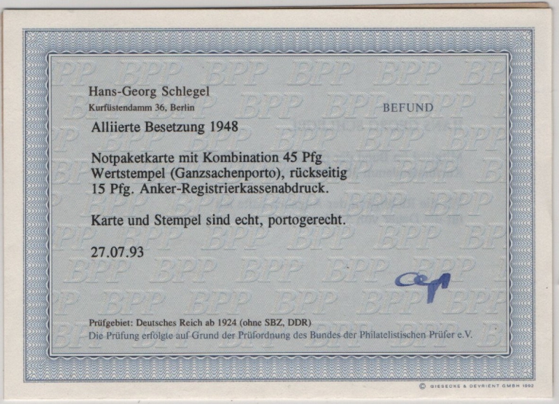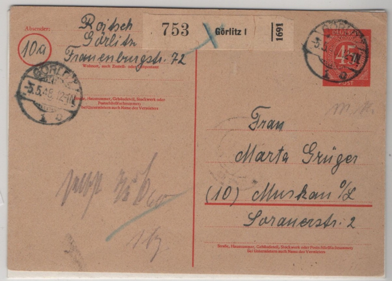 D, Kontrollrat / OST, 1948, GS.- Mi.- Nr.: 955, gebraucht als Notpaketkarte für 1 Paket von Görlitz nach Muskau, Befund Schlegel BPP!
