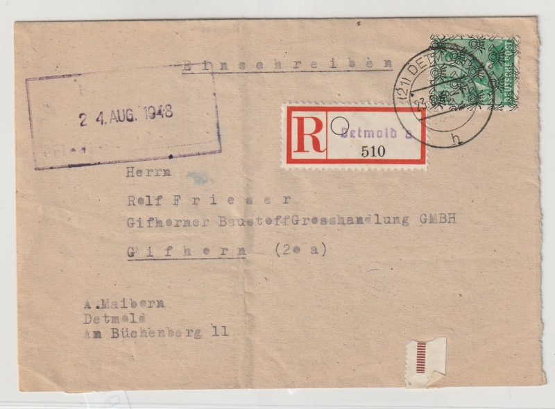 Bizone, Mi.- Nr.: 51 II als EF auf Einschreiben- Fernbrief von Detmold nach Gifhorn