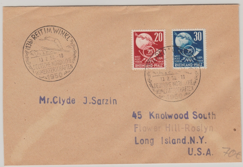 FRZ / Rheinland- Pf., 1950, Mi.- Nr.: 51- 52, in MiF auf Auslandsbrief von Reit im Winkel nach Long Island (USA)