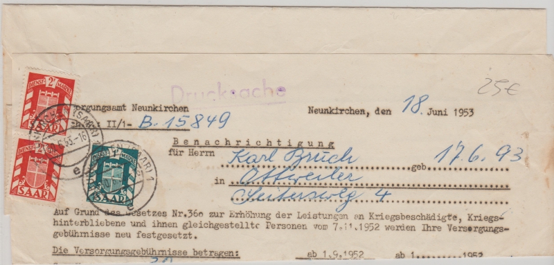Saarland, DM Mi.- Nr.: 35 + 36 (2x) als MiF auf Drucksache