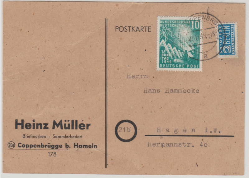 BRD, 1949, Mi.- Nr.: 111 als EF auf Fernpostkarte von Coppenbrügge nach Hagen