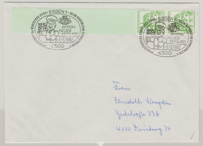 BRD, 1982, Mi.- Nrn.: 1038 (2x), (1x mit Rollenendstreifen), in MeF auf Fernbrief von Essen nach Duisburg