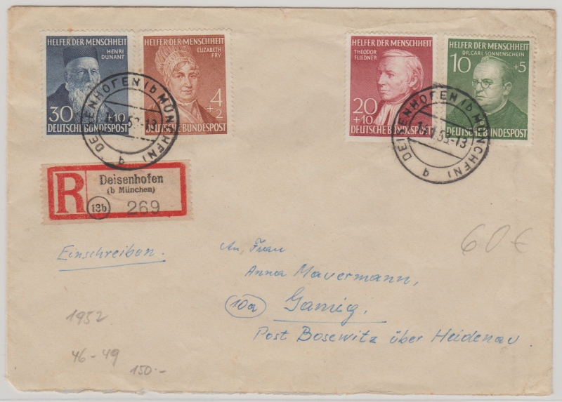 Nrn.: 156- 159, als MiF auf Satzbrief- Einschreiben von Deisenhofen nach Ganig (?)