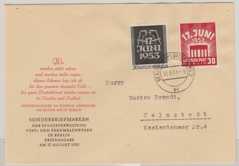 Berlin, 1953, Mi.- Nr.: 110 + 111 auf adressiertem FDC nach Helmstedt