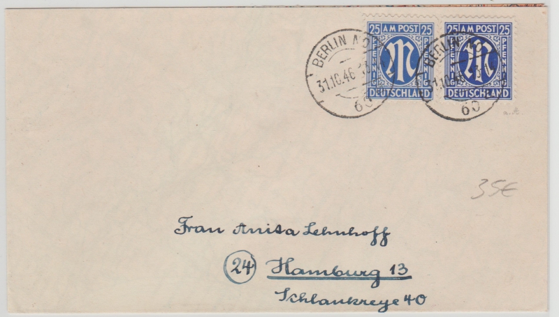 Berlin, AM- Post in Berlin verwendet, 2x 25 Pfg. als Fernbriefporto nach Hamburg, letzter Gültigkeitstag! Sehr selten!