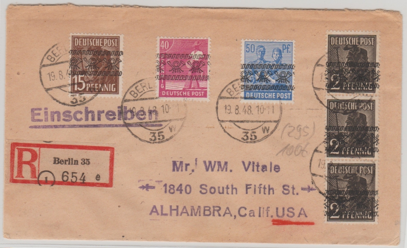 Berlin, Bizone in Berlin verwendet: Mi.- Nrn.: 36 I (3x) + 41 I + 47 I + 48 I als MiF auf Auslands- Einschreiben in die USA