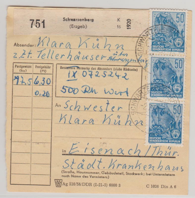 DDR, 1958, Mi.- Nr.: 457 (13 x, vs. + rs.) in MeF auf Paketkarte, sehr seltene Verwendung!