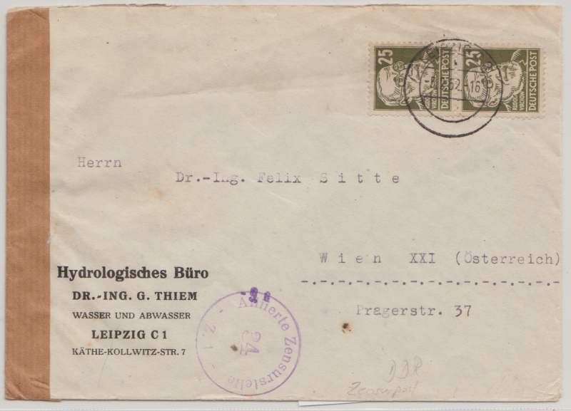 DDR / SBZ, 1952, Mi.- Nr.: SBZ 221(2x), in MeF auf Auslandsbrief von Leipzig nach Wien, mit Zensur