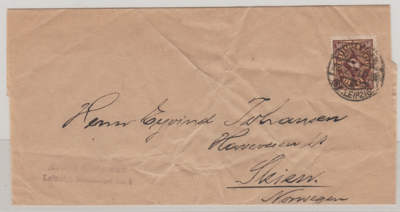 DR, Infla, 1923, Mi.- Nr.: 208 in EF auf Auslands- Streifband von ... (Bez. Leipzig) nach Skiern (Norwegen)