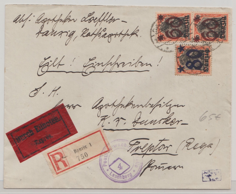 Danzig, 1920, Mi.- Nr:: 19 (2x) + 20 als MiF auf Express- Einschreiben- Fernbrief von Danzig nach Treptow, mit Zensur!!