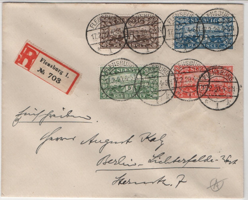 Schleswig, 1920, Mi.-Nrn.: 1- 14, als MiF auf 2 Einschreiben- Fernbrief, von Apenrade / Flensburg nach Berlin