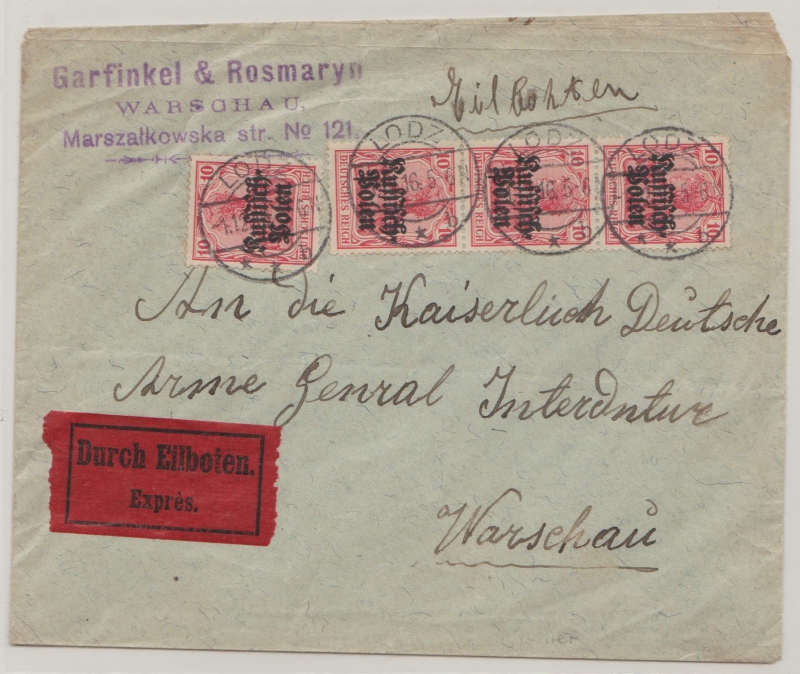 Dt. Post in Polen, 1916, Mi.- Nr.: 3 (4x) als MeF auf Eilboten- Fernbrief von Lodz nach Warschau