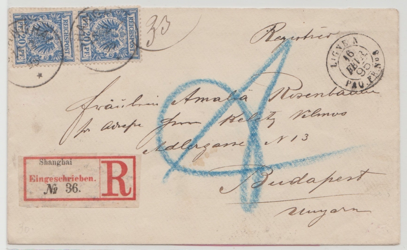 DAP China, 1895, Mi.- Nr.: V48 (2x) als MeF auf Auslands- Einschreiben von Shanghai nach Budapest