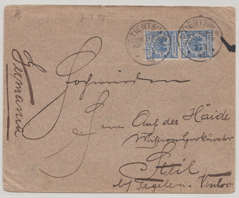 DAP China, 1898, Mi.- Nr.: V48 (2x) als MeF auf Auslandsbrief (2. Gewichsstufe?) von Tientsin nach Tegelen (NL)