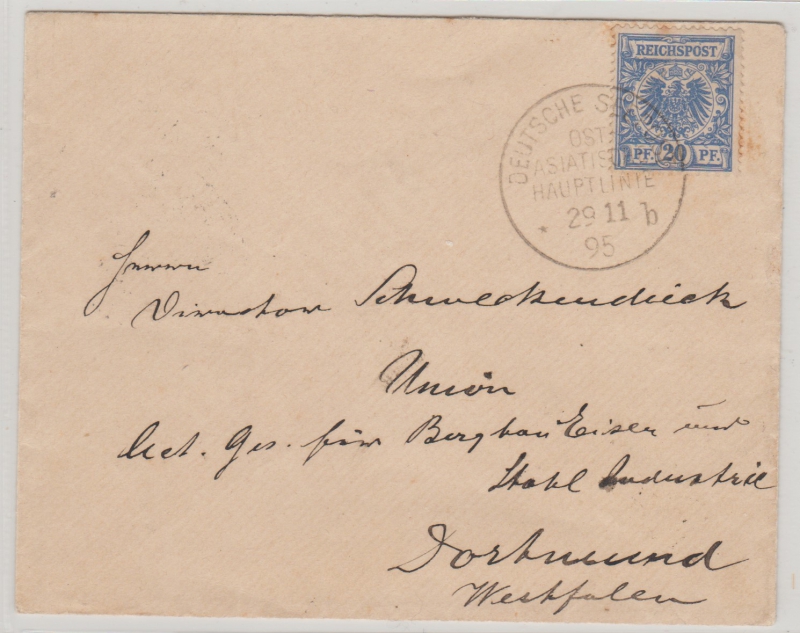 DR, DAP China, Deutsche Seepost, Ostasiatische Hauptlinie, b, 1895, Mi.- Nr.: V 48, als EF auf Brief nach Dortmund