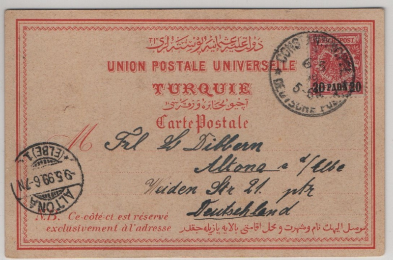 DAP Türkei, 1899, Mi.- Nr.: 7, als EF auf Auslandspostkarte von Constantinopel nach Altona (D.), gute Postkarte!