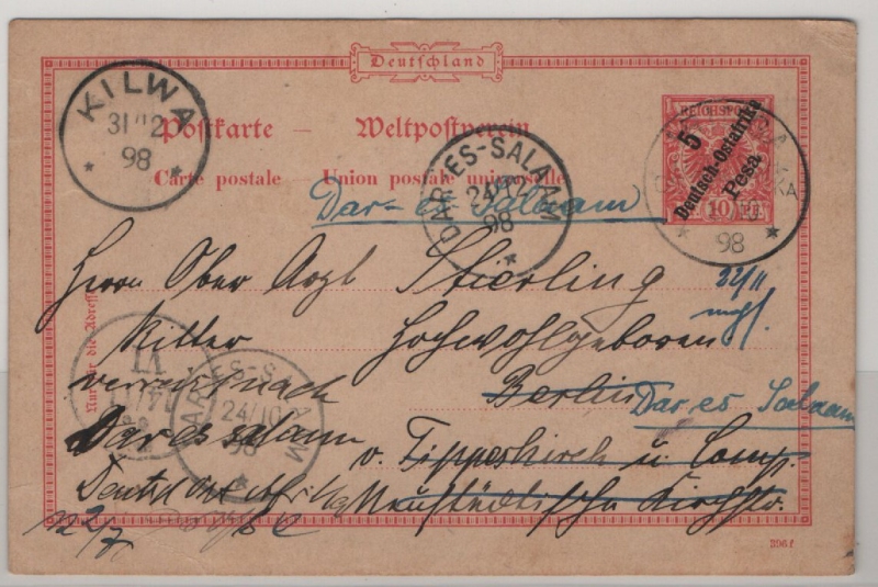 DOA, 1898, 5 Pesa- Überdruck- GS (Mi.- Nr.: P 6) als Fernpostkarte von Iringa nach Berlin, Nachgesand via Kilwa nach Dar-es-Salam