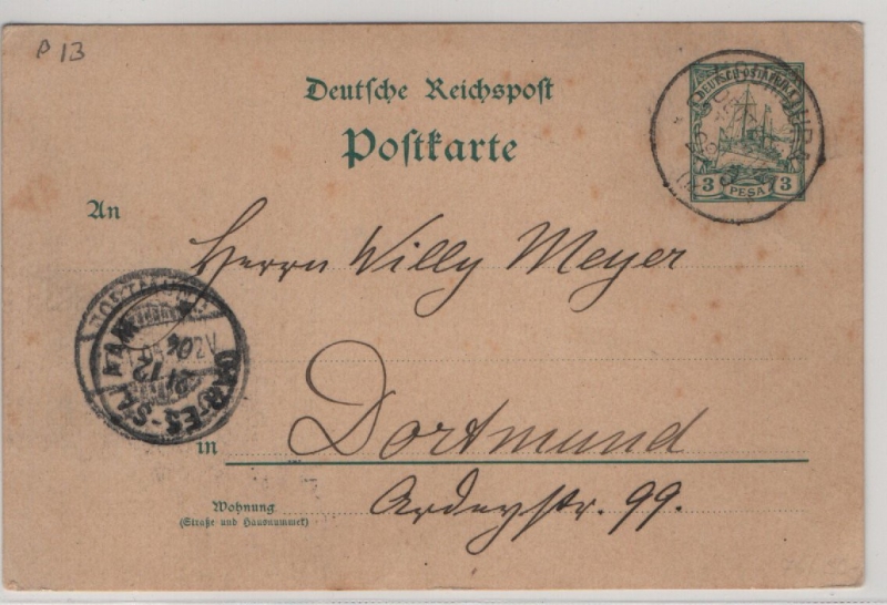 DOA, 1904, 3 Pesa- GS (P13), gelaufen von USUMBURA, via Dar-Es-Salam nach Dortmund