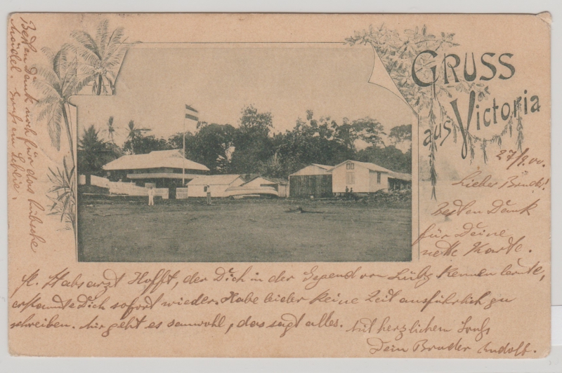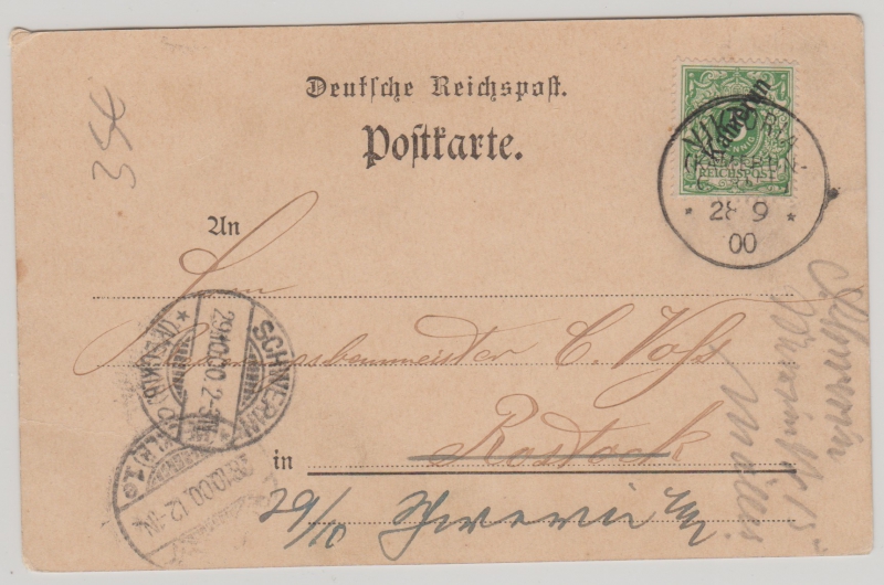 Kamerun, 1900, Mi.- Nr.: 2 als EF auf Postkarte von Viktoria nach Rostock, und von hier weitergesandt nach Schwerin