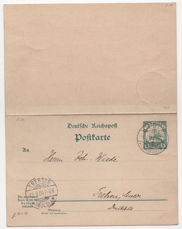 Samoa, 1907, 5 Pfennig- Antwort- GS (Mi.- Nr.: P7) mit Stempel "APIA", gelaufen nach Trebsen und zurück von Leipzig nach Apia!