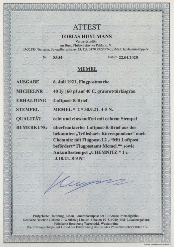 Memel, 1921, Mi.- Nr.: 69 (4x, im Sr. 4er- Block) als MeF auf Luftpost- R- Fernbrief von Memel nach Moys, akt. FA Huylmans BPP!