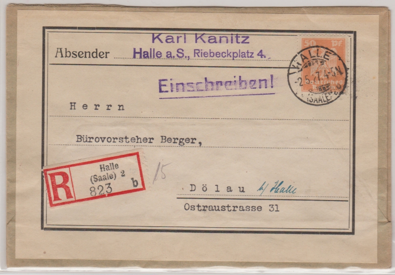 Weimar; Mi.- Nr.: 361 als EF auf Einschreiben (in den Landzustellbereich ???) von Halle nach Dölau