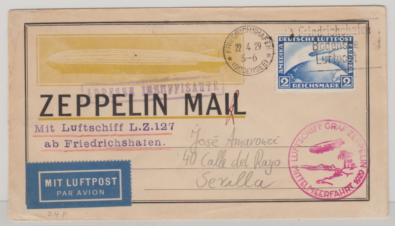 DR, 1929, Mi.- Nr.: 423 als EF auf Zeppelinbrief von Friedrichshafen via Mittelmeerfahrt 1929 nach Sevilla (Ankunftsst.!)