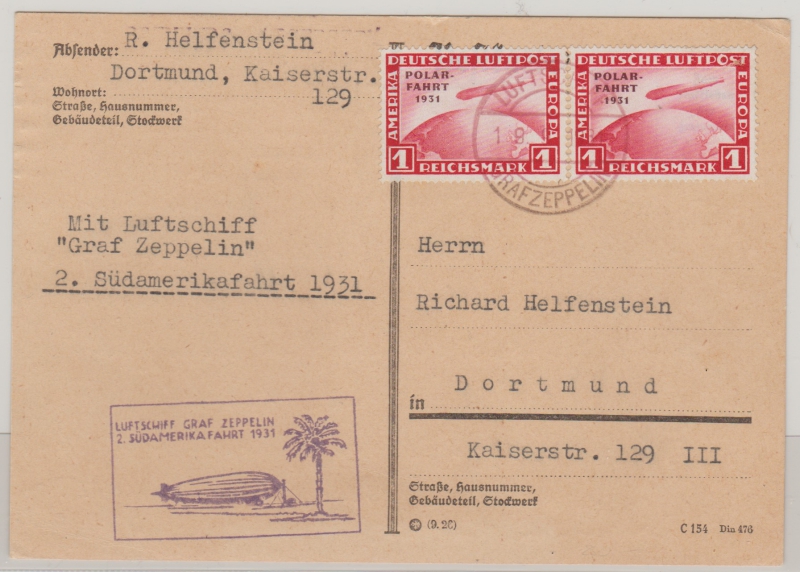 DR, 1931, Mi.- Nr.: 456, als MeF auf Postkarte via Zeppelin von Dortmund via 2. Südamerikafahrt nach Dortmund